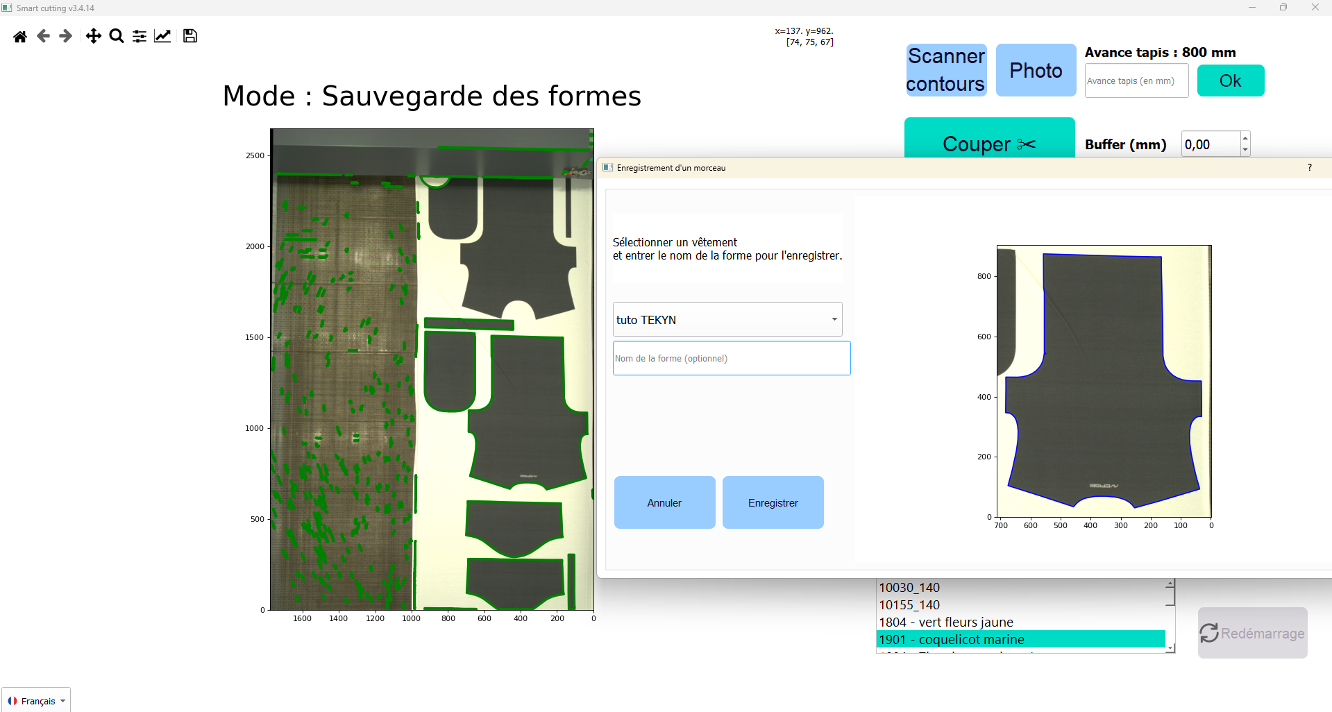 • Pour se faire, cliquer sur “Photo” pour prendre une photo du plan de coupe. Le temps de traitement est plus rapide que aucune analyse de contour est alors lancée.