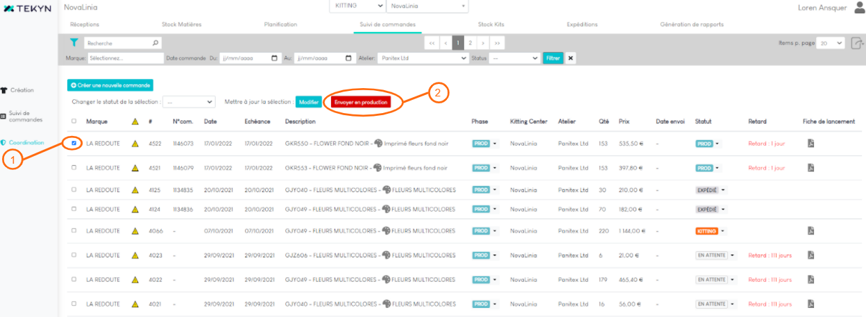 - Vérifiez les commandes dont vous souhaitez lancer la production (1), et cliquez sur “Envoyer en production(2).