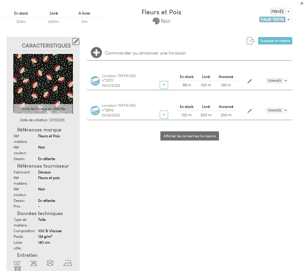 - Dans la page de modification de matière, cliquez sur “commander ou annoncer une livraison