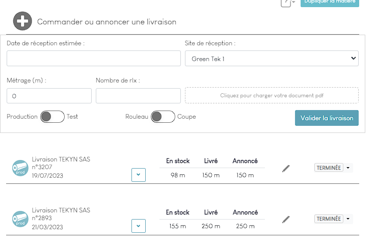 - Entrer la data de réception, le site de réception (l'atelier), le métrage commandé, le nombre de rouleaux