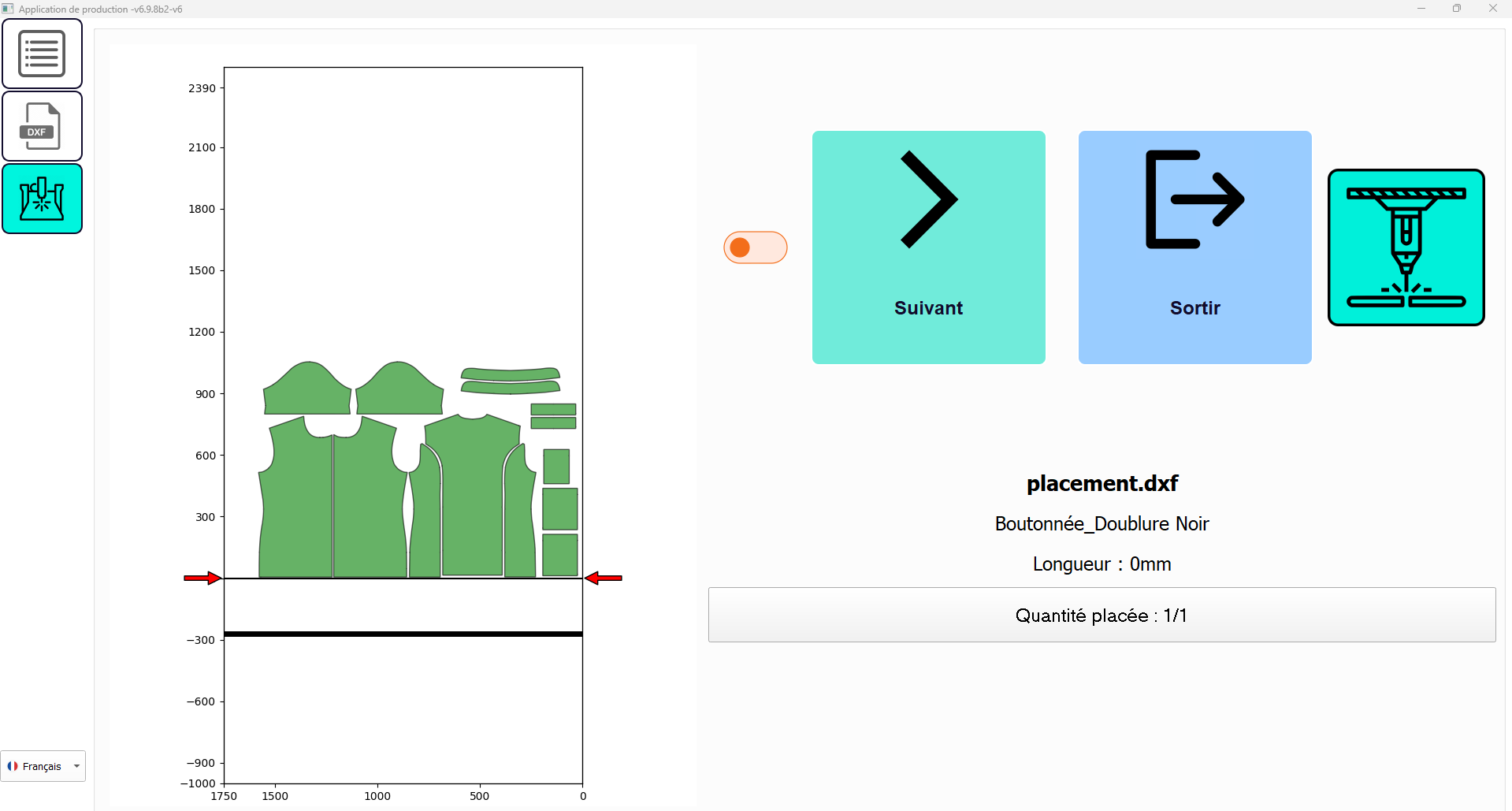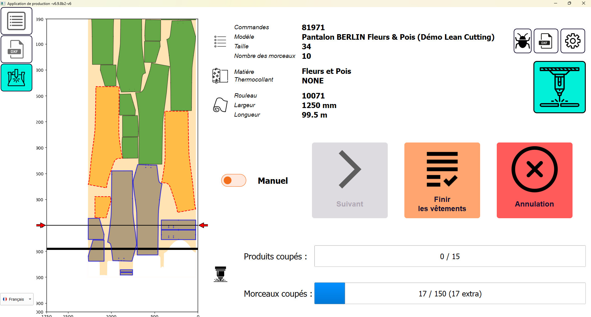 - Lean Cutting connecté au Backoffice qui permet de couper des commandes à partir d'une quantité de produits (sans placement au préalable) → Premier logo en haut à gauche