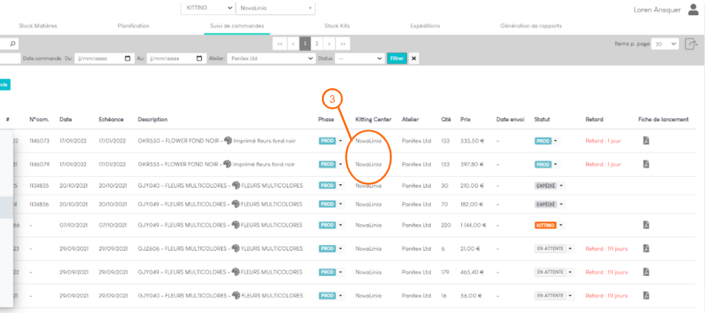 1. Vérifiez que vous êtes chez le bon Kitting Center (3).